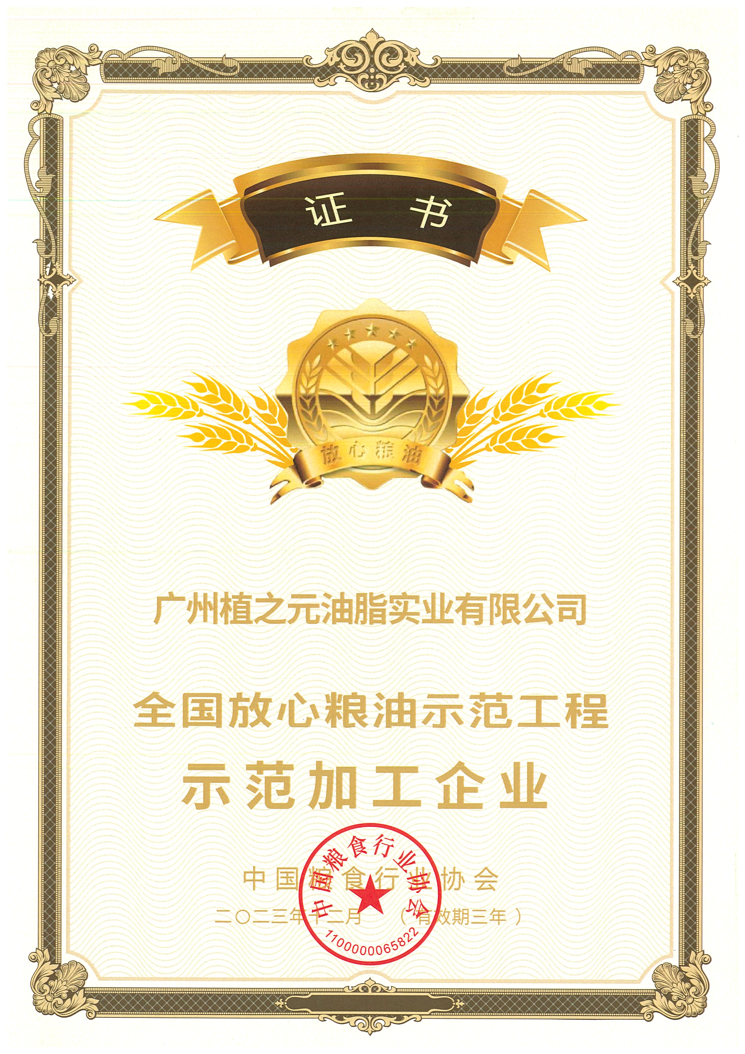 全国放心粮油示范工程示范加工企业证书